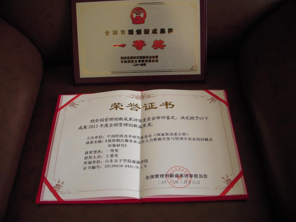本次研讨会上,王爱英教授撰写的论文《我国酒店服务业女性人力资源开发与管理中存在的问题及对策研究》被全国管理创新成果评审委员会授予“全国管理创新成果”一等奖并获颁证书及奖牌,同时被收入大会优秀文论集。通过参加本次研讨会,促进了与大会专家和各大企事业单位及高校同行的交流,扩大了我院的影响,对于促进我院旅游行业人力资源管理领域内的研究必将起到积极作用。