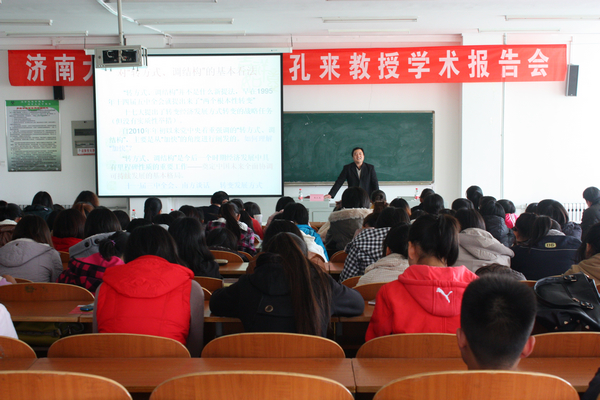 11月10日,济南市软实力研究中心主任、济南大学硕士生导师朱孔来教授应邀来我校为师生作题为《济南市转方式 调结构》的学术报告。报告会由旅游学院院长王爱英教授主持,科研处处长刘中文教授向朱教授颁发了客座教授聘书。