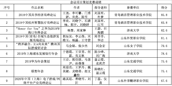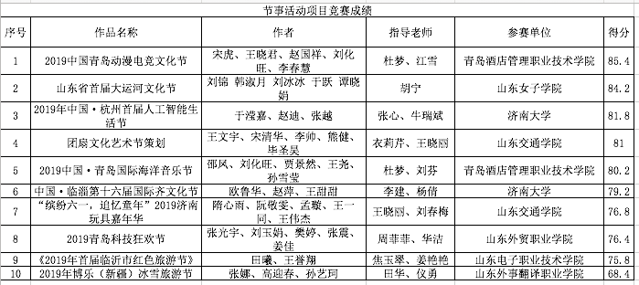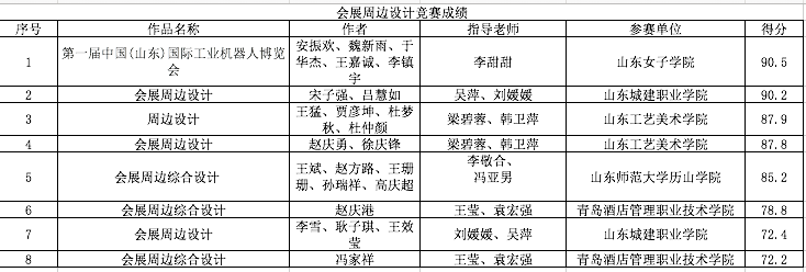 经过第一天的适应场地与调整状态,我院学生在第二天的比赛中,以良好的精神面貌,优秀的作品,专业的态度,在各自的项目组中取得了优异的成绩排名,分数如下。具体获奖通知随后会在山东省商务厅、山东会展网等网站发布。