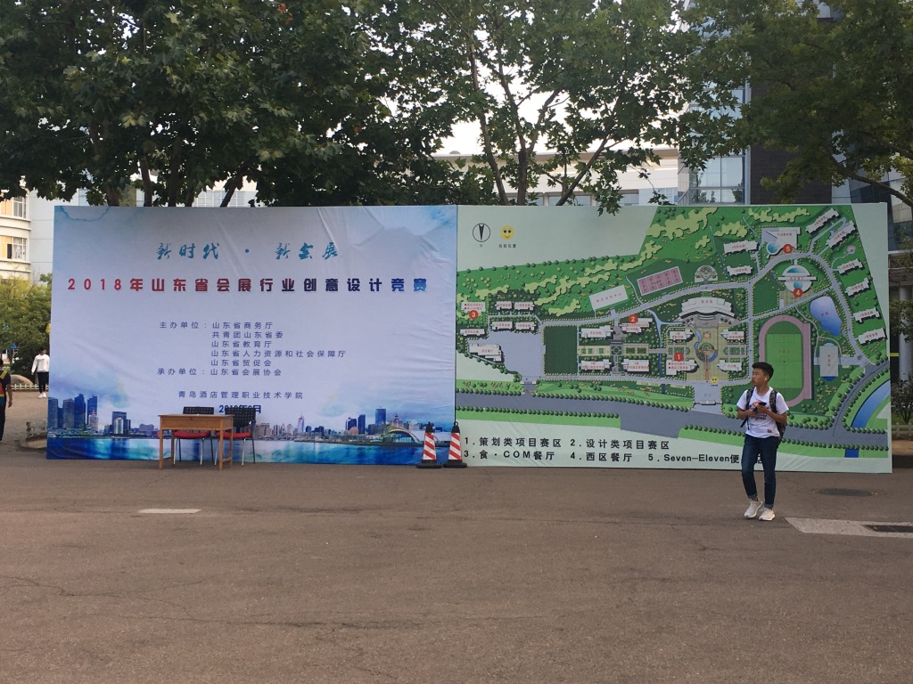 山东省会展行业创意设计竞赛是由省商务厅、团省委、省教育厅、省人力资源社会保障厅、省贸促会联合主办,山东省会展业协会承办的赛事,已经连续四年举行,今年的竞赛主题是“新时代,新会展”。竞赛面向在职策划专业人员,在职设计专业人员,在校学生,采取制定命题和自主命题相结合的方式进行,竞赛项目分策划类和设计类两大类、7个分项。经过前期的校内作品征集与初赛选拔,我院三组学生进入决赛。此次参加决赛的包括省内十余所开设旅游、会展、酒店、设计等相关专业的高校,参赛作品策划类37组,设计类26组。