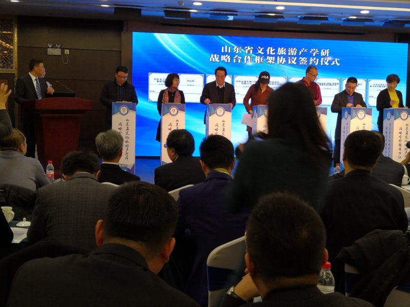 大会现场,济南市人民政府副市长孙斌、山东省文化和旅游厅副厅长张鲲为“山东文旅产学研联盟”揭牌。山东大学、山东师范大学和我校等11所驻济高校,山东文旅集团等31家集团企业,以及沂水县、沂南县、单县和济南13个县区,与济南旅游智库、济南旅游联合会,共同签订了山东文旅产学研五方战略合作框架协议。各方将本着“优势互补、互惠互利、友好协商、真诚合作、讲求实效、共同发展”的原则,在智力支持、人才培养、项目落地等方面开展互动交流,搭建校、地、企融合平台。