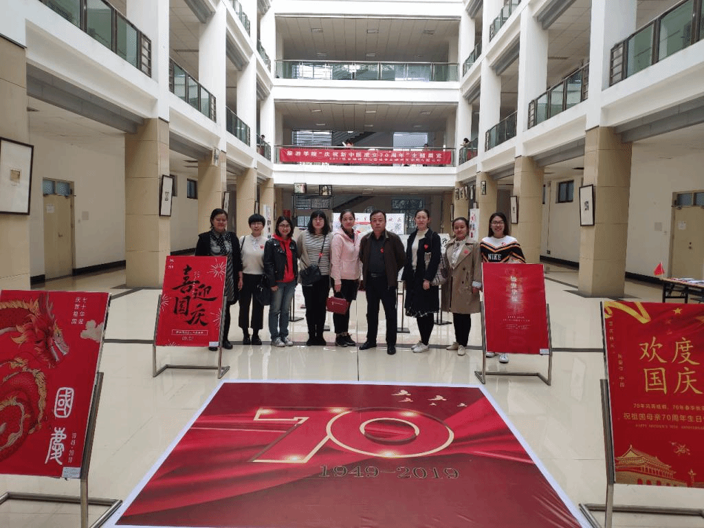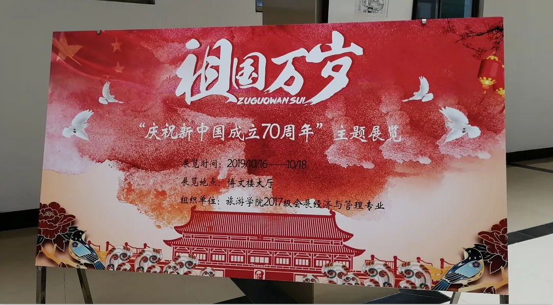 2019年是新中国成立70周年,旅游学院会展经济与管理专业学生在教研组老师的带领下,根据“壮丽70年,阔步新时代”主题实训周工作安排,策划准备此次展览活动。通过前期策划准备、作品征集评选。会场布置于10月15日下午完毕,16日正式开展,旅游学院院长张明、教研室老师,辅导员老师等人参观了此次展览,并对此次展览提出殷切希望。