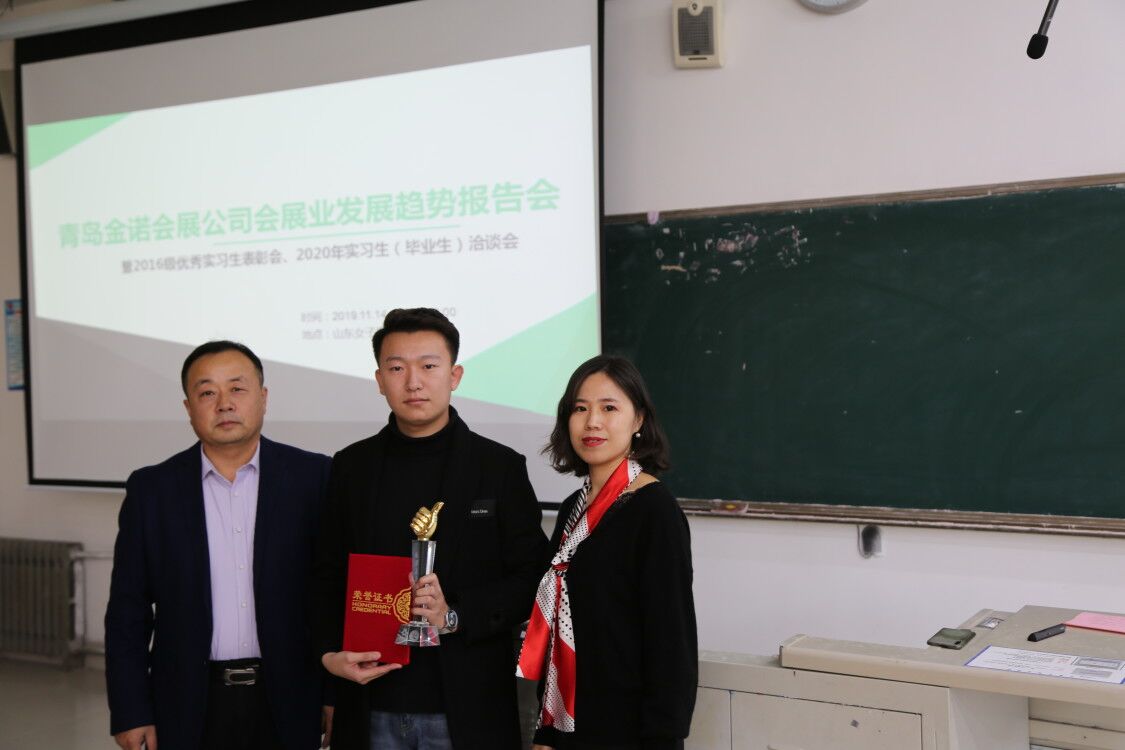 11月14日下午,金诺会展青岛分公司总经理吴玉龙一行4人来我校进行招聘宣讲,并做了主题为会展业发展趋势的报告。此次会议对已在金诺完成专业实习的2016级实习生进行了表彰奖励,旅游学院院长张明发言并要求我院会展专业与金诺会展公司加强合作交流,共同开发课程和项目,培养优质的会展专业人才,实现专业建设与社会需求同频共振!金诺会展公司董事长助理卢炫文结合国家政策和经济发展趋势就会展业未来发展进行了阐述,金诺会展公司人事经理秦晶详细介绍了金诺会展公司的发展历程、取得的成绩和未来的人才需求。会后2016、2017级同学就实习和就业进行咨询并进行了简单面试。