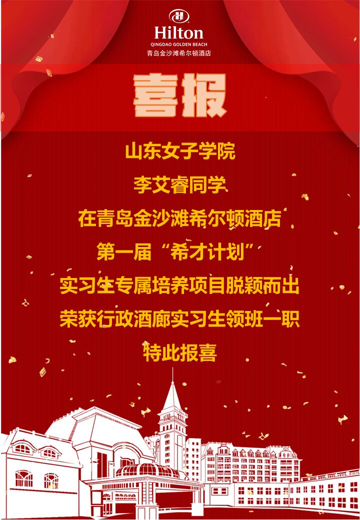 2019级旅游管理专科学生李艾睿同学在青岛金沙滩希尔顿酒店实习期间表现优异,被酒店提拔为实习生领班一职。