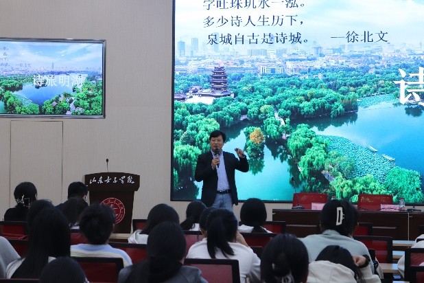 黄鸿以《美美文旅 美美事业 美好生活》为题,带领同学们了解诗和远方是最幸福的事业。朱晓宽分享了《诗旅明湖》,济南自古有诗城的雅号,将明湖的每个景点用一诗一人一故事展开,开启了一段诗词之旅。刘虎讲解了《跟着老舍赏济南》,通过老舍先生的视角,带领同学们认识济南。杨学坤从如何选择有吸引力的主题进行讲授,通过分析成功的短视频案例,帮助同学们提高了短视频制作能力。