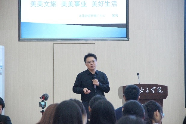 为了让学生尽快了解济南的文化和旅游,对济南的城市文化、城市旅游、城市精神、城市品格、城市气质、城市活力、城市创新、城市环境、城市创业有一定感知,2023年10月26日下午,山东女子学院旅游学院联合济南市文化和旅游局举办“迎新美美文旅分享会”,通过分享济南美景、美图、美文、美人、美食让大学生认识济南,读懂济南,爱上济南并选择济南。济南市旅游宣传推广中心数字推广负责人、高级经济师黄鸿,济南金牌导游工作室刘虎,齐鲁名导、济南文旅大数据研究会主任朱晓宽,济南电视台导演杨学坤担任主讲人,全院130余名学生参与分享会。