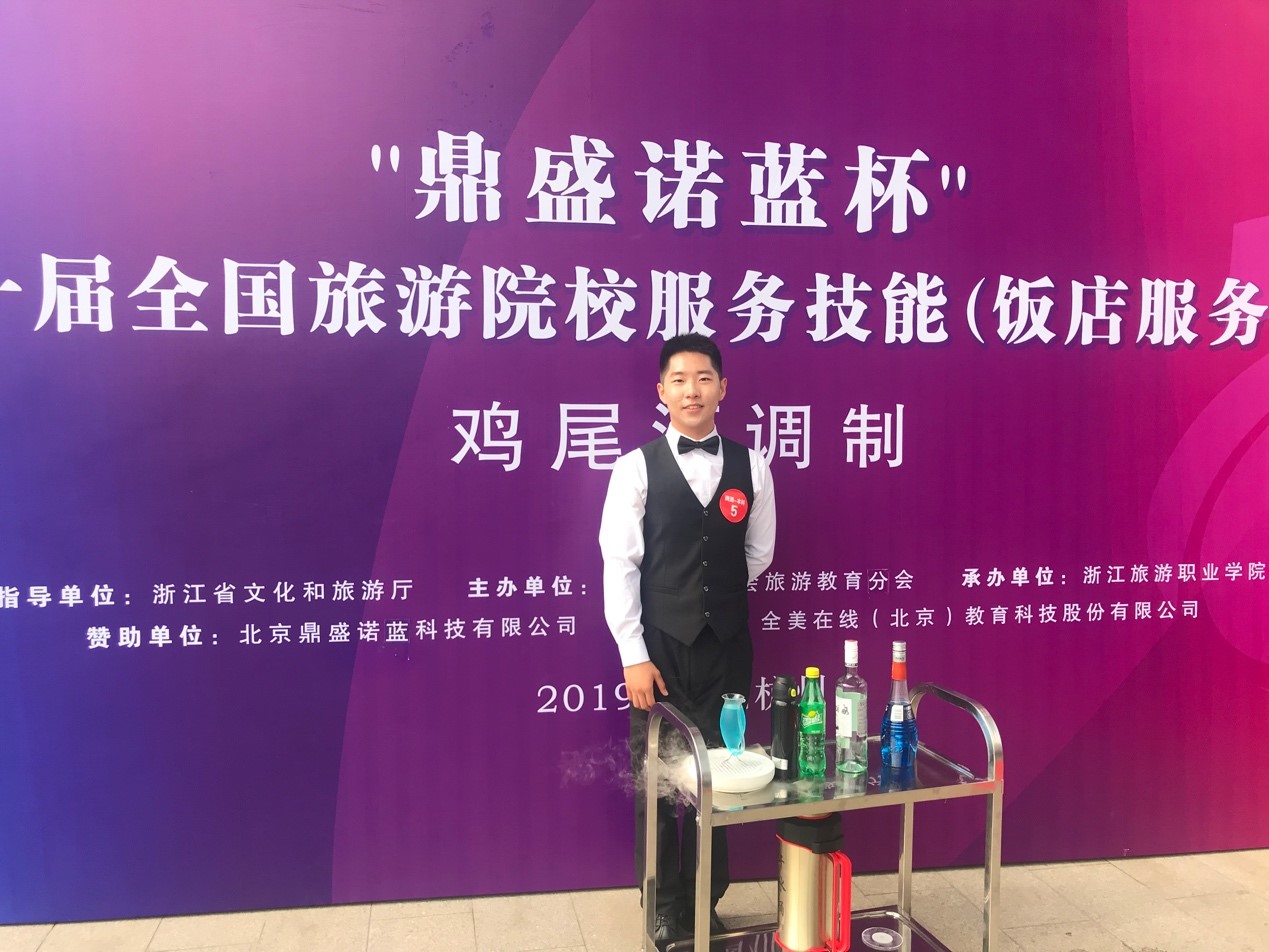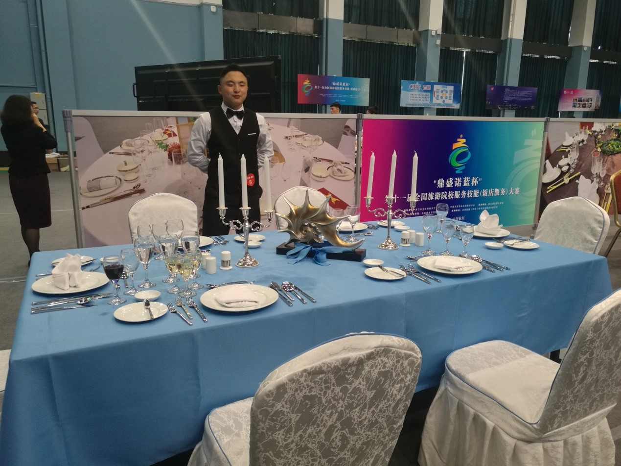 5月16日-5月19日,我院酒店管理教研室负责人刘文彬、旅游管理专业教研室负责人王晓伟、于梅好等3位老师带领2017级旅游管理专业(春季高考本)4名学生赶赴浙江杭州参加“鼎盛诺蓝杯”第十一届全国旅游院校服务技能(饭店服务)大赛,并取得了优异成绩。本次大赛是由浙江省文化和旅游厅指导、中国旅游协会旅游教育分会主办、浙江旅游职业学院承办的一次全国性赛事,参赛选手来自全国28个省市,230所院校,共954位选手参赛。本次大赛(本科组)共设中式铺床及开夜床、鸡尾酒调制、中餐宴会摆台及西餐宴会摆台四个分项,每个单项我院均派出学生代表参加比赛。