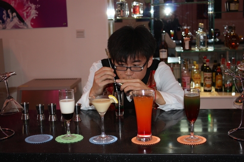 该中心按照真实的营业性酒吧设计,同时突出实验(训)功能。主要设备有:吧台、酒柜、沙发、茶几、吧椅、制冰机、碎冰机、冰箱、陈列柜等。主要鸡尾酒调制的原料有:威士忌、白兰地、金酒、朗姆酒、伏特加、特基拉、君度、味美思、马天尼、咖啡蜜、蛋黄酒、蓝橙、紫罗兰、棕可可、绿薄荷等。在这里,学生能够充分体会鸡尾酒调制的全过程,品味鸡尾酒文化的独特魅力。通过实验(训),学生能够调制出七色彩虹、天使之吻、蓝色夏威夷、玛格丽特、长岛冰茶、环游世界、曼哈顿、椰林飘香等几十种时尚鸡尾酒品种,达到初级调酒师的水平。