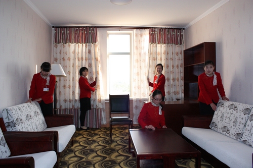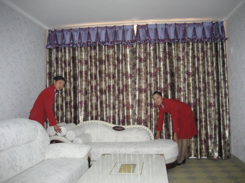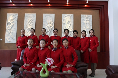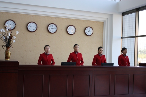 前台接待区是按照星级酒店标准建立的,主要设有前台、问讯处、礼宾部、收银处、商务中心等相关部门;而客人休息区、飞天壁雕、牡丹屏风则构成一个相对独立的空间,供客人休息或者进行商务洽谈。