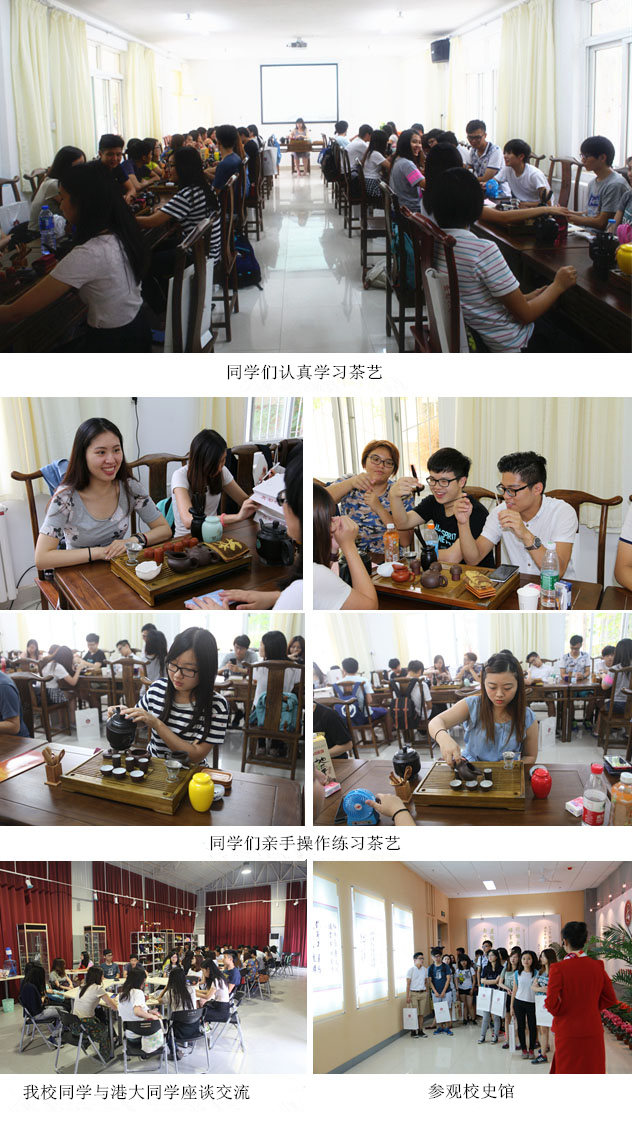 7月11日香港大学42名学生来我校学习交流并参观我院女大学生综合素质教育实验(实训)中心,我院师生热情接待了香港大学同学,并且为香港大学同学们安排了颇具特色的茶艺课。李杨老师为同学们讲授中华传统茶文化,讲授茶的特质、茶的功效、茶艺器具、礼仪、表演等,带领同学们学习茶艺;港大学子亲手泡沏清茗、学习礼法,同学们在古典的韵律中体验茶艺的唯美意境,体会茶文化“精勤俭德”的精神内涵,心灵得到陶冶。