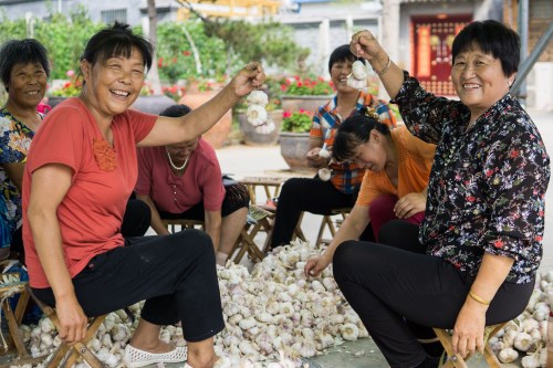 村里的大蒜有了好收成 村民们在向志愿者们展示