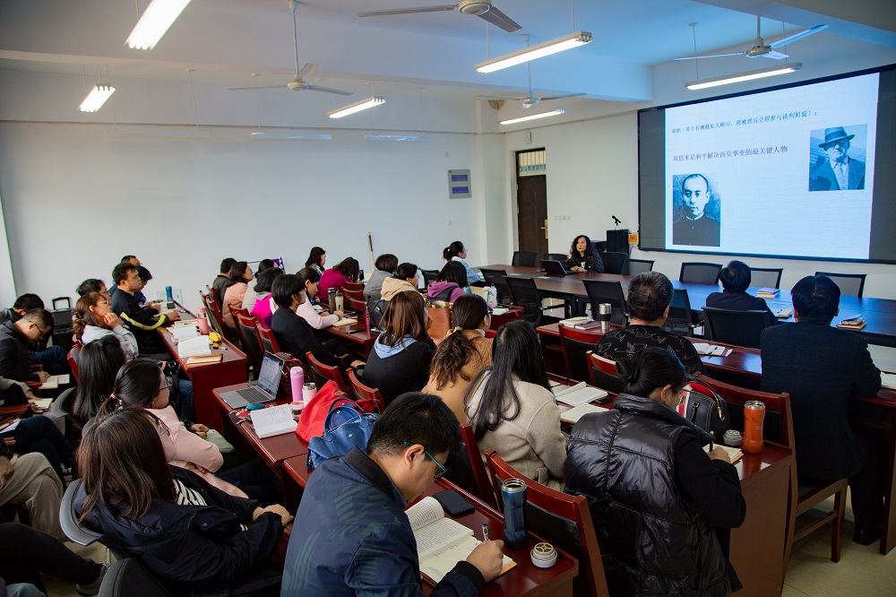 刘娜老师围绕“危机”、“统战”、“博弈”、“转折”四个方面详细梳理了西安事变的历史脉络。这次讲座使老师们深刻地体会到在此次事变中,我们党从中华民族的根本利益出发,以抗日大局为重,发挥了力挽狂澜的作用。