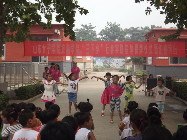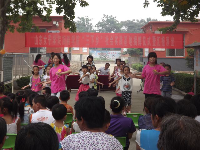 7月24日,我院“爱在路上”暑期“三下乡”社会实践团队,在济南平阴县东平洛小学举行社会实践基地揭牌仪式暨汇报演出活动。旅游学院副院长李厚忠和东平洛小学校长袁军一起为社会实践基地揭牌,为活动的开展和双方的交流合作奠定了良好的基础,更为双方以后的交流合作架起了桥梁。接着由“爱在路上”全体成员自编、自导、与小朋相互配合完成了文艺汇演,为当地百姓送上了丰富的文化精神大餐,完美的展现了“爱在路上”团队几天来的支教成果。