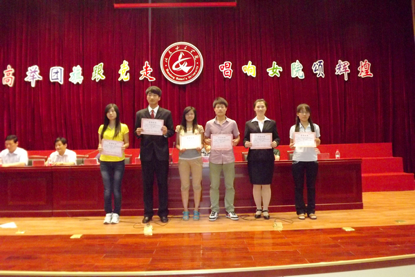 在大会个人表彰中,我院的王晓艳同学荣获国家奖学金,石燕飞同学荣获 “朝阳助学”奖学金,蔡娜娜同学被评选为省级优秀学生,宋金飞同学荣获山东女子学院校园十佳学生称号。在第十二届“挑战杯”山东省大学生课外学术科技作品竞赛中获奖的孙苗、李斌等同学也接受了学校的表彰。