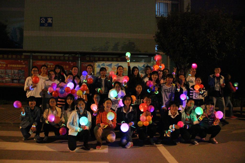 此次“荧光夜跑”活动有近百名同学参加,她们身上带着荧光饰品,手持荧光气球,把整个操场装点成一个荧光闪耀的海洋。“荧光夜跑”采用小组闯关计时制,每四人组成一个小组,小组成员必须全部通过设置的五个关卡,用时最少的小组获胜。每个关卡都设有专门裁判记录小组成员的任务完成情况,看图说成语,搞怪拍照,趣味拼图,填写歌词,层层关卡妙趣横生,操场上欢笑声不断。