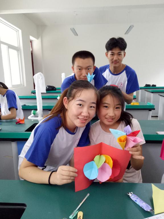到达学校后,调研小组成员们积极与孩子们进行互动和交流。在做完自我介绍后,双方对彼此都有了初步的了解。随后,成员们将事先准备好的练习本,彩纸,橡皮泥等物品一一发送到孩子们的手中,并开始了上午的活动。成员们和孩子们一起折纸、玩橡皮泥,创作出一件件有趣的作品,教室里欢声笑语不断。在这过程中,孩子们也一改刚开始见面时的羞涩和不安,渐渐和成员们熟悉起来,有的孩子甚至当起了小向导,为成员们介绍一些村里的情况。