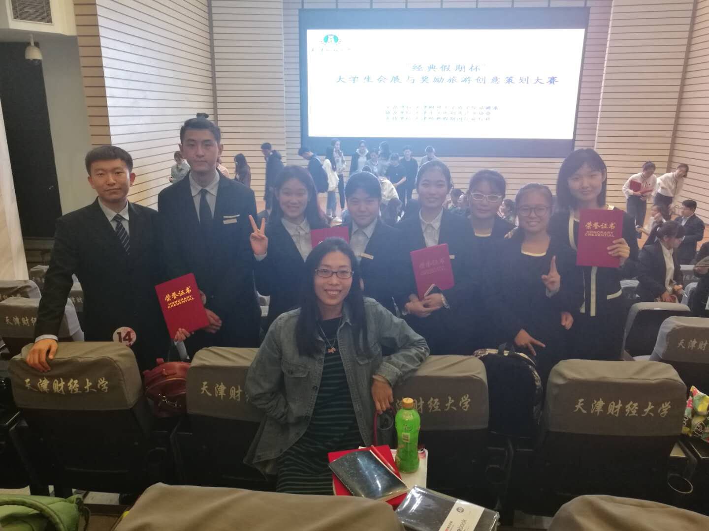 近日,我院积极组织参与由天津财经大学商学院旅游系主办、天津市文化创意产业协会协办的“经典假期杯”大学生会展与奖励旅游创意策划大赛。经过组委会前期对全国20余所高校的100余份参赛作品层层选拔评审,最终我院安振欢、王嘉诚、石美会、陈文荟设计策划的《2018第十五届齐文化节策划方案》,王雨菡、于跃、李玉洁设计策划的《“异想记”主题公园策划方案》两份作品入围决赛。两支参赛团队于2017年10月21日在指导老师胡宁老师和柳雯老师的带领下前往天津财经大学参加决赛。