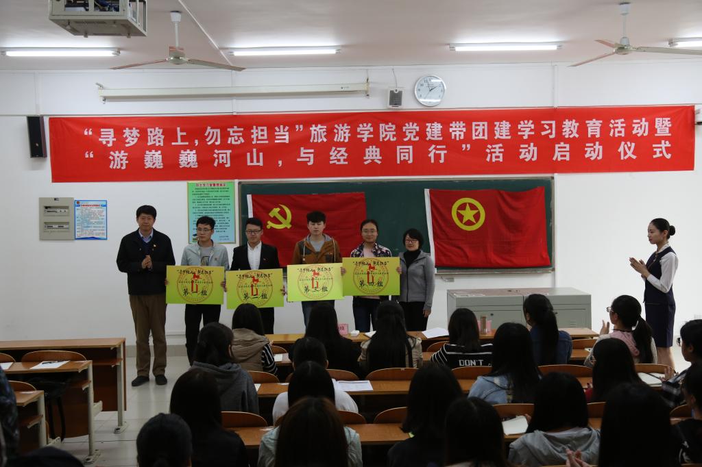 2017年4月12日下午,旅游学院开办的“游巍巍河山,与经典同行”活动启动仪式正式举办。出席本次活动的有校团委书记王鲁、旅游学院党总支副书记孔晓晓、旅游学院学生党支部书记、团总支书记赵贵阳、旅游学院在校学生党员、团员及各班代表。