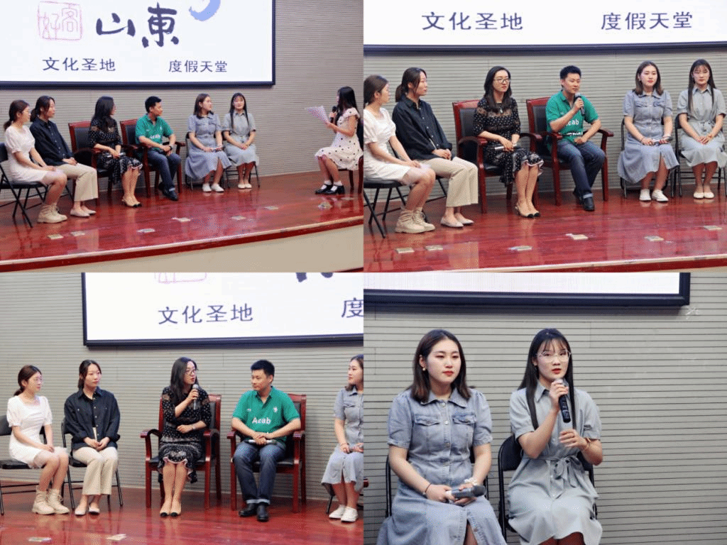 交流会首先由郭泽清为大家进行导游讲解展示。郭泽清讲解风趣幽默、言简意赅,短短几分钟的讲解,让同学们游遍了美丽的泉城济南,了解了千佛山、趵突泉、大明湖等景点背后的故事,仿佛身临其境,久久不能自拔。