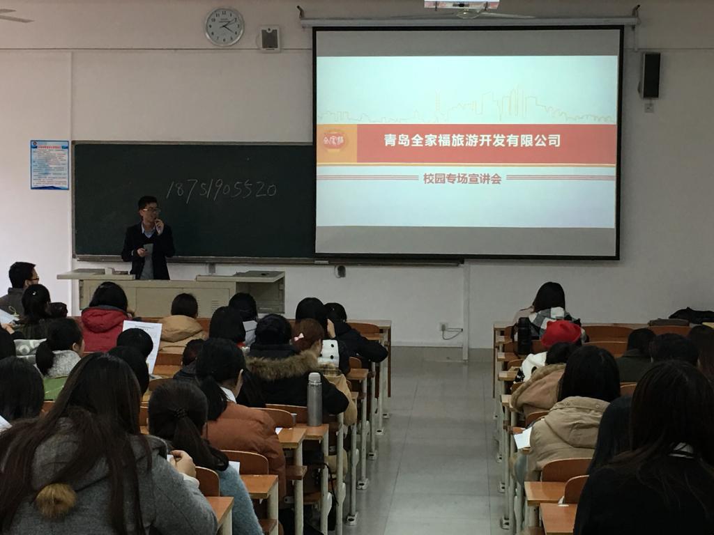 为了使2017届毕业生学生有一个更好的就业机会,也为他们能够对毕业后就业有一个深度的了解。我院于2016年12月1日下午13:00在博文楼201教室联合南京五方国际旅行社、南京塔克餐饮有限公司、青岛全家福旅游开发有限公司举办一场以旅游类专业就业的宣讲会。我院2017届毕业生100余人参加本次宣讲会。