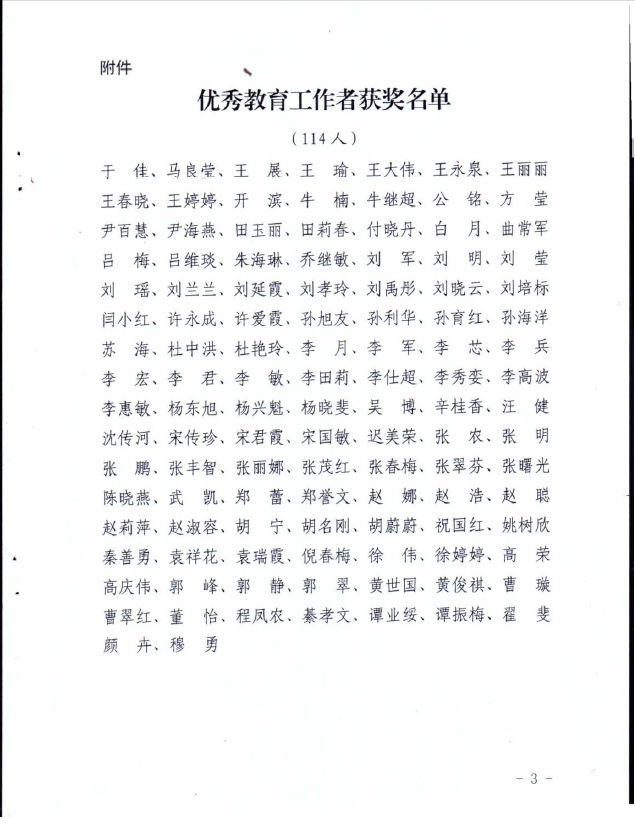 根据《山东女子学院2017年处级领导班子和处级干部任期届满考核实施办法》(鲁女院党字〔2017〕27号)和《关于开展2017年工作人员年度考核工作的通知》(鲁女院发〔2018〕15号)的相关要求,经个人述职、民主测评、公示、学校审批等程序,旅游学院方莹、曲常军、刘莹、许爱霞、张明、张鹏、张丽娜、胡宁8位同志获得“山东女子学院2017年度优秀教育工作者”荣誉称号。