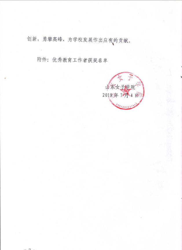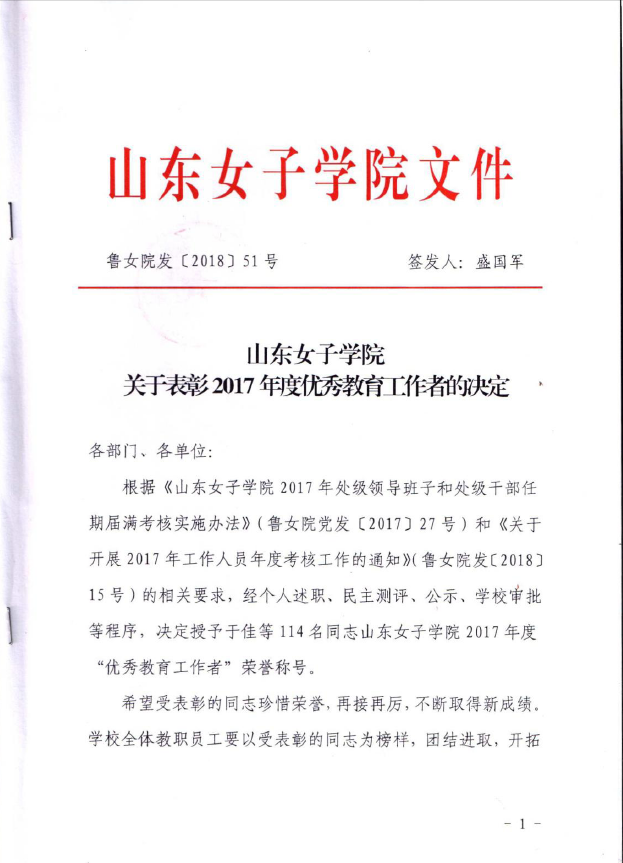 获得“山东女子学院2017年度优秀教育工作者”荣誉称号
