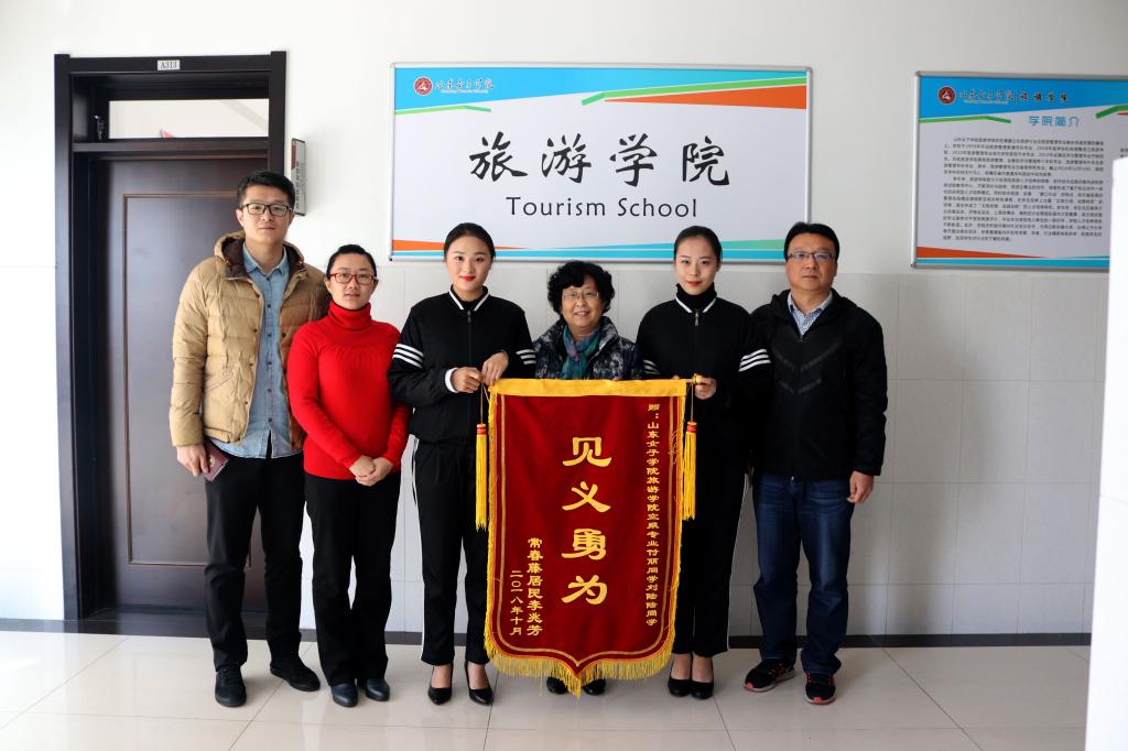 11月13日上午,济南市长清区常春藤社区居民李兆芳的家属激动的来到旅游学院,向2018级空乘专业学生付丽、刘陆陆赠送“见义勇为”锦旗。