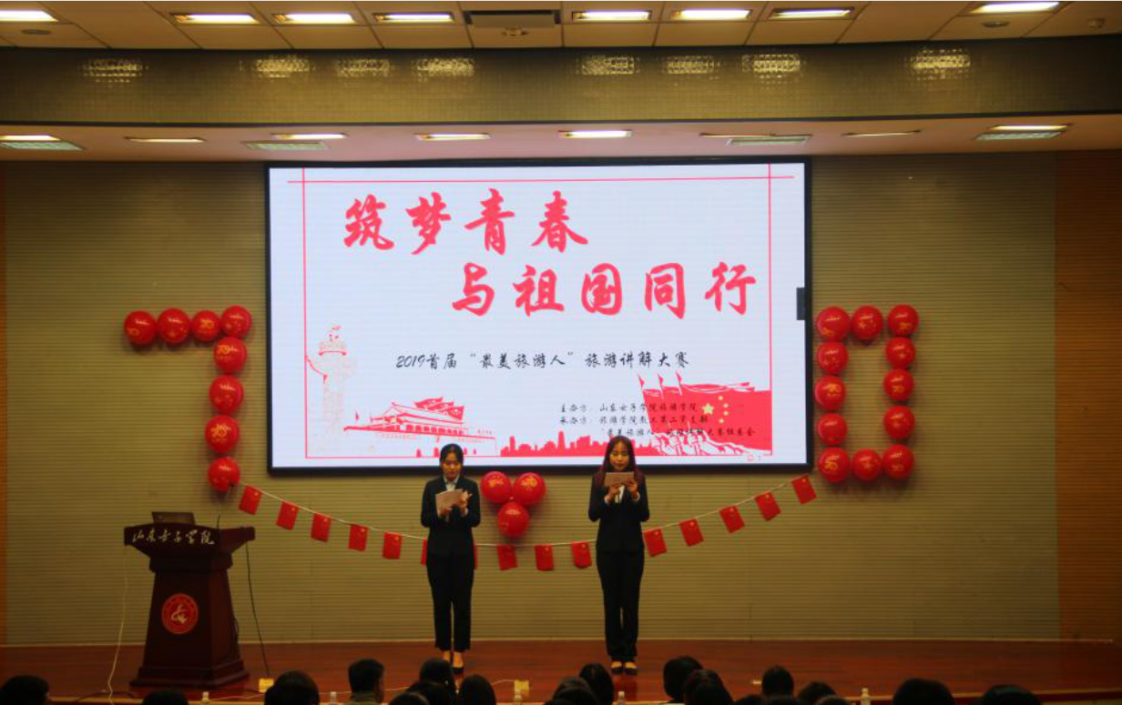 2019年10月17日下午,由山东女子学院旅游学院教工第二党支部、会展经济与管理专业2017级学生共同承办的2019首届“最美旅游人”旅游讲解比赛在图书馆一楼报告厅举行。此次比赛是继“美丽中国与我同行”之后又一主题党日与专业实训周相结合的探索实践,围绕“不忘初心,牢记使命”的教育主题,讴歌新中国70年历变,献礼祖国母亲。