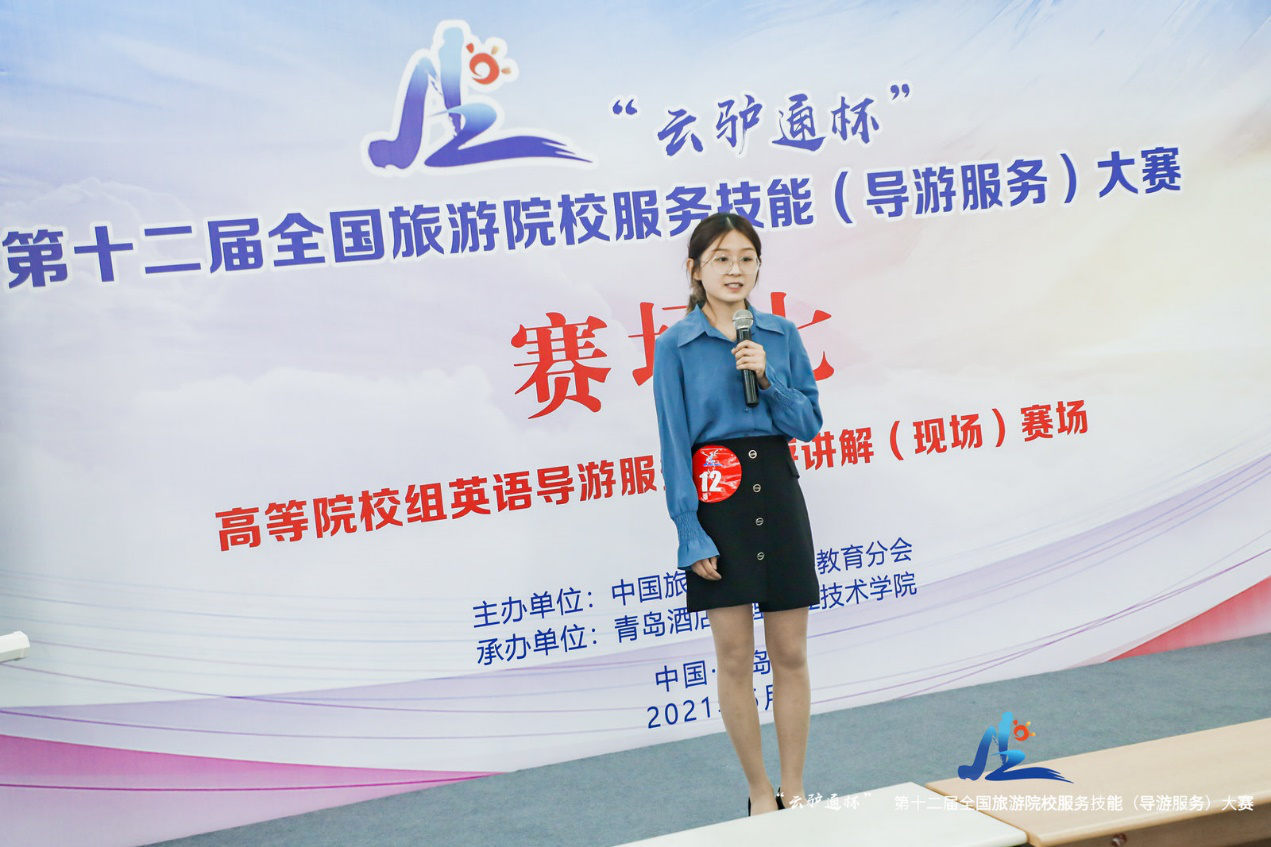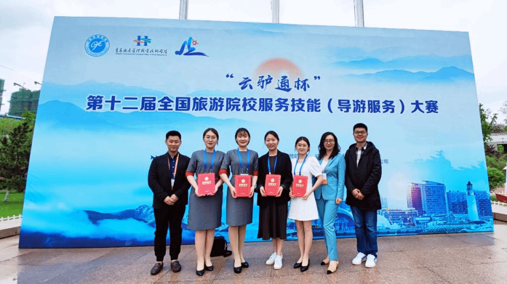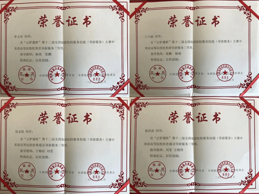 2021年5月13日至5月16日,旅游学院刘莹老师带队,张鹏、王晓伟随队带领旅游学院4名学生参加了第十二届全国旅游院校服务技能(导游服务)大赛,并获得优异成绩。本次大赛来自全国344所高校1200余名学生参赛,比赛包括理论考试、导游讲解、才艺展示等环节,经过激烈的角逐,我院来自2017级旅游管理本科班的郭泽清、2019级旅游管理本科班的郑龙悦荣获全国导游服务技能大赛中文导游组三等奖,2020级旅游管理专升本的李玉双、王玉丽荣获全国导游服务技能大赛英文导游组三等奖。两个月的准备,一个周的集训,三天的比赛,付出的汗水、泪水都将成为每位学生和指导老师成长的动力。