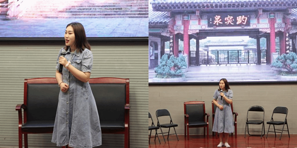交流会首先由郭泽清为大家进行导游讲解展示。郭泽清讲解风趣幽默、言简意赅,短短几分钟的讲解,让同学们游遍了美丽的泉城济南,了解了千佛山、趵突泉、大明湖等景点背后的故事,仿佛身临其境,久久不能自拔。