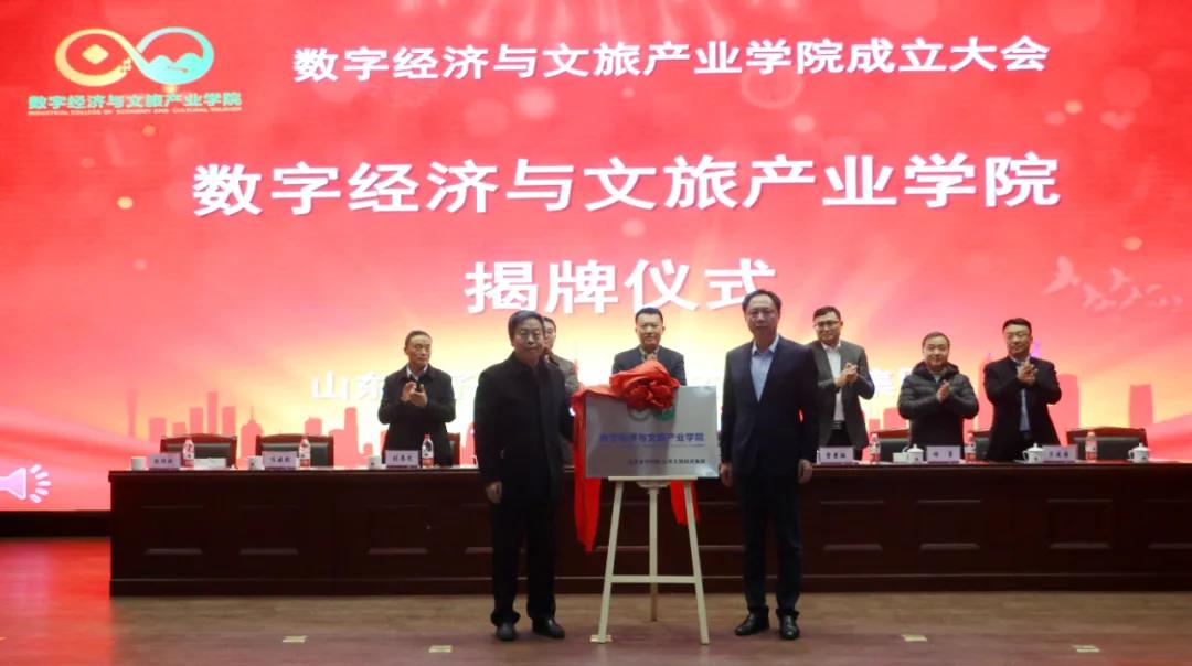 山东女子学院党委副书记、校长盛国军与山东省国欣文化旅游发展集团有限公司党委副书记、总经理丁艺为数字经济与文旅产业学院揭牌。