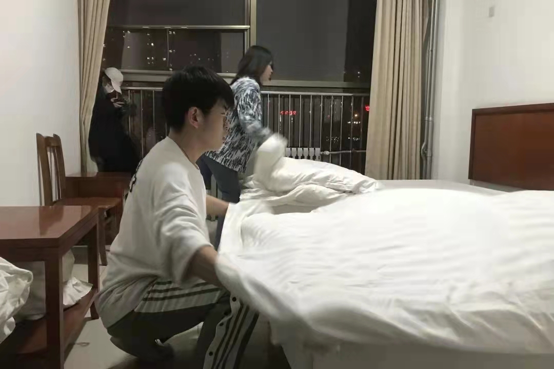 中式铺床比赛中,各位参赛选手动作娴熟敏捷,甩单定位、包角、装被、套枕每一个步骤都认真操作、在规定的时间内把一张床铺得平整规范。评委老师们从仪容仪表、专业技能、整体流畅度、平整度、操作素养等几方面进行全面考评。
