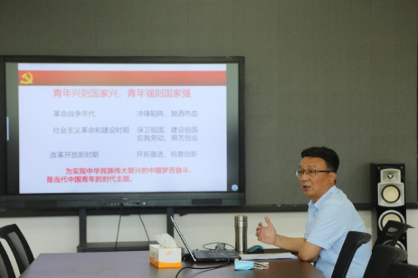 2022年5月19日,为深入学习和贯彻习近平总书记在庆祝中国共产主义青年团成立100周年大会上的重要讲话精神,旅游学院党委书记吕建国为学生党支部学生上了一堂题为“努力成长为堪当民族复兴重任的时代新人”的专题党课。