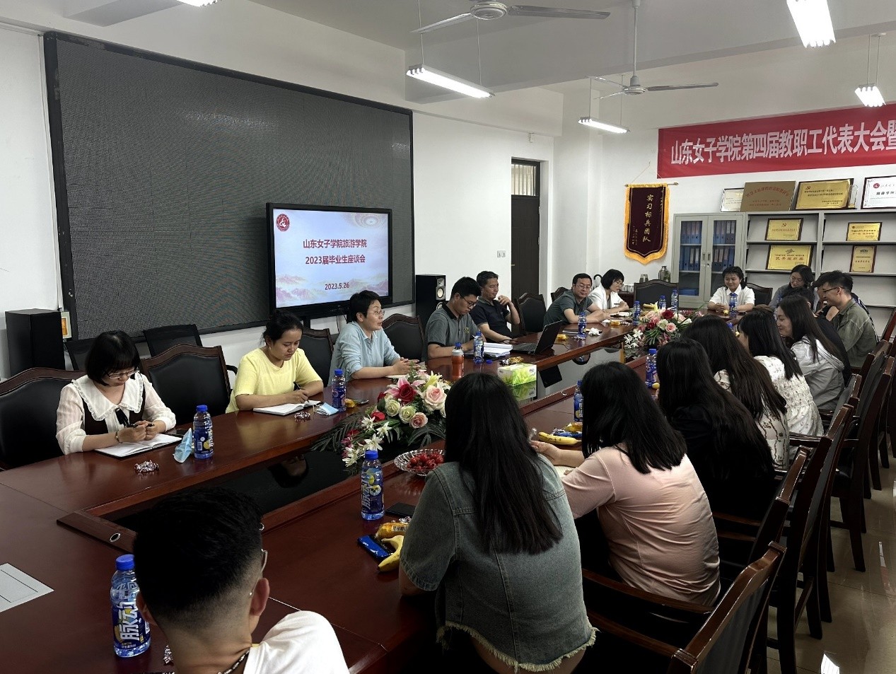 值学生毕业离校之际,为推进人才培养质量不断提升,增进与学生的感情交流。5月26日,旅游学院隆重举办了2023届毕业生座谈会。座谈会由学院副院长许爱霞主持、副书记张守华及学院骨干教师代表参加了此次座谈。