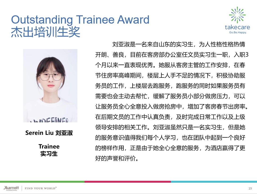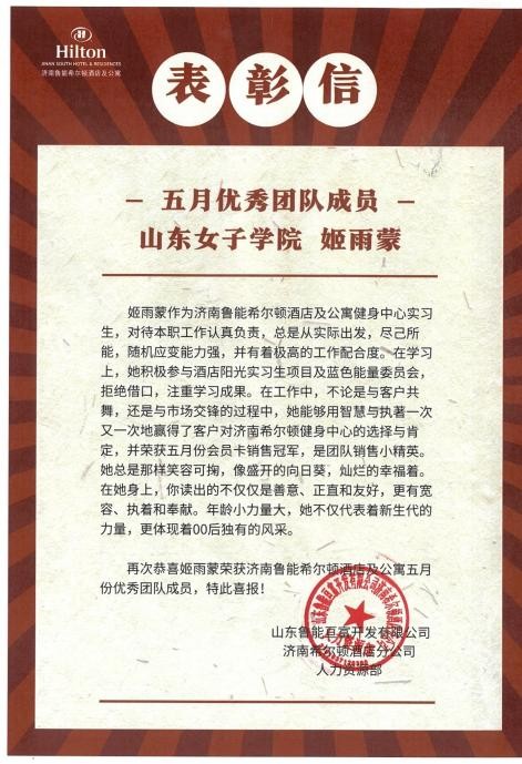 近日,旅游学院频频收到来自实习合作单位的喜报。学院2020级专科实习生孟慧在青岛金沙滩希尔顿酒店希才计划中脱颖而出,竞聘为餐厅实习生领班;实习生姬雨蒙在工作中认真负责,随机应变能力强,表现十分优异被济南希尔顿酒店及公寓评为“5月优秀月度员工”;实习生刘亚淑被湖州喜来登酒店评为“杰出培训生奖”。