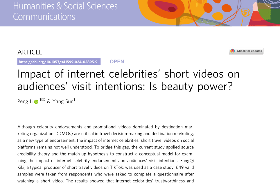 近日,我院教师李鹏、孙杨的研究论文Impact of internet celebrities’ short videos on audiences’ visit intentions: Is beauty power?在Nature子刊Humanities & Social Sciences Communications上发表,山东女子学院旅游学院为唯一署名单位,该论文受到旅游学院标志性成果培育项目支持。