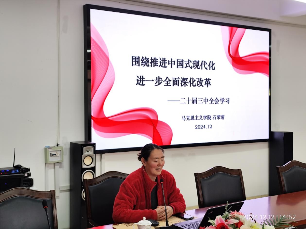 2024年12月12日下午,学校马克思主义学院副院长石荣菊教授应邀,为学院全体教职工带来了一场题为《围绕推进中国式现代化 进一步全面深化改革——二十届三中全会学习》的专题讲座。