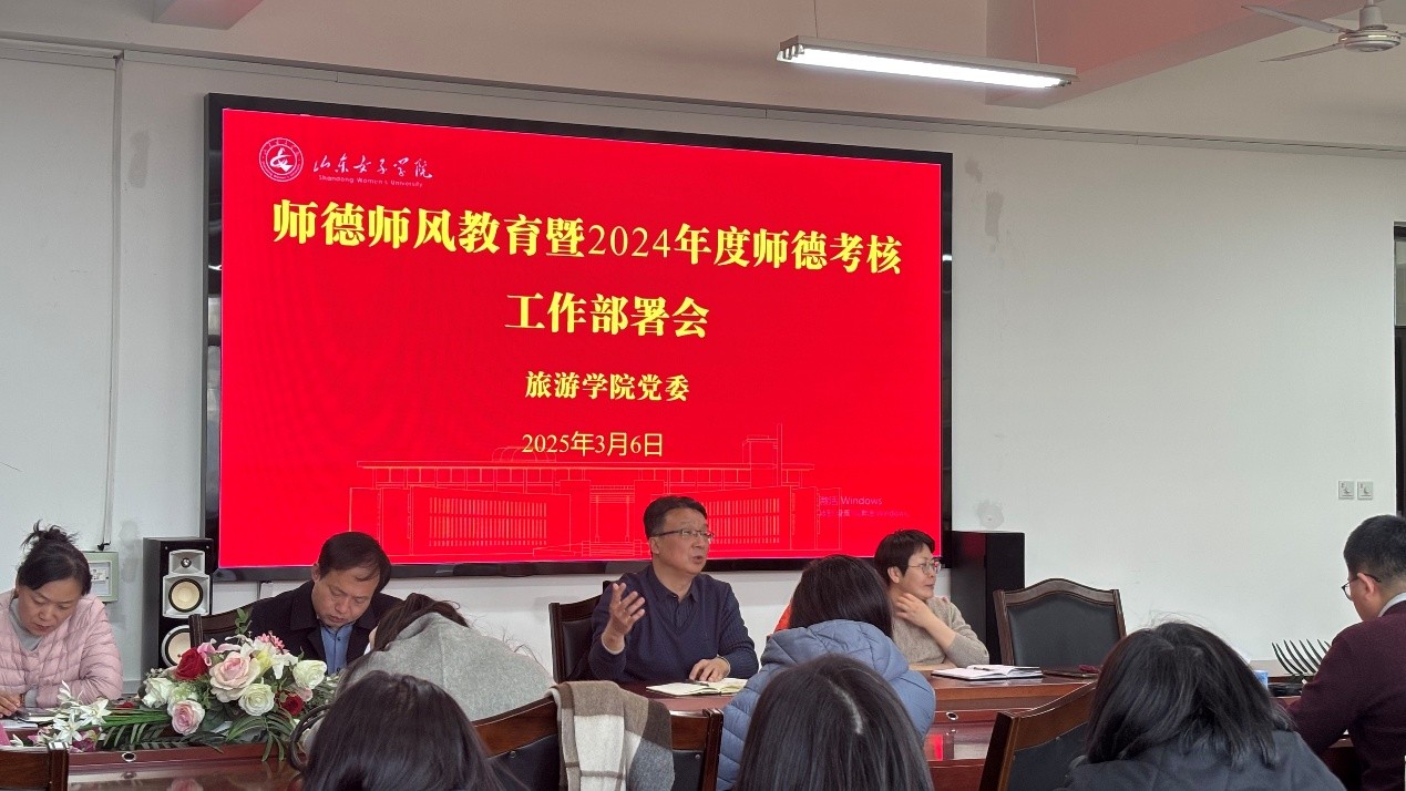 为深入贯彻新时代教师队伍建设要求,旅游学院于3月6日开展了师德师风教育暨2024年度师德考核工作部署会,全面解读《山东女子学院师德考核办法》等文件,通过制度约束与价值引领双轮驱动,筑牢教师职业行为底线。会议由学院党委书记吕建国同志主持,旅游学院全体教职工共同参与。