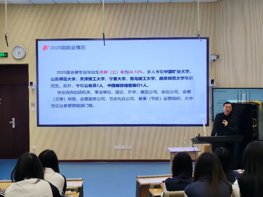 李鹏老师以“我们是谁”(What is the MICE?)“我们在哪儿”(How about the MICE major in SDWU?)“我们要做什么”(What we learn ?)“未来怎样”(What about the future?)为主线,系统阐述了会展行业的现状与发展前景,介绍了山东女子学院会展专业的人才培养模式、师资队伍、教学资源与实践教学体系,重点解读了本科阶段的培养目标、课程设置与学业要求。结合行业动态和学生个人发展路径,分析了会展专业多元化的毕业去向,进一步增强了学生的专业认同感和学习积极性。
