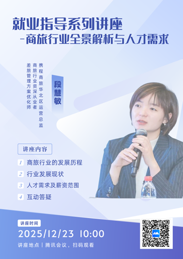 聚焦商旅行业发展新态势,精准对接学院毕业生就业需求,12月23日上午,学院举办了“商旅行业全景解析与人才需求”线上专题讲座。本次讲座吸引了学院数百名应届毕业生在线参与,为即将步入职场的学子搭建了深化行业认知与职业规划的桥梁。