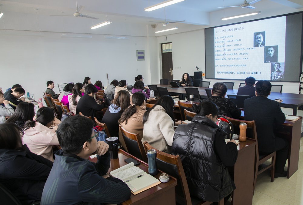 刘娜老师围绕“危机”、“统战”、“博弈”、“转折”四个方面详细梳理了西安事变的历史脉络。这次讲座使老师们深刻地体会到在此次事变中,我们党从中华民族的根本利益出发,以抗日大局为重,发挥了力挽狂澜的作用。