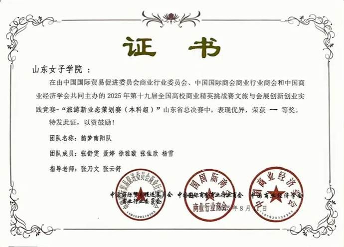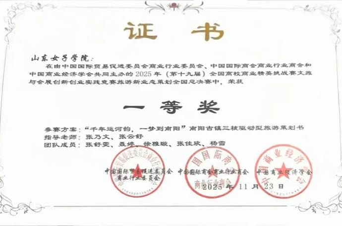 秉持“以赛促学、以创提质”的理念,徐雅璇主动投身科创实践与学科竞赛,在挑战中锤炼专业技能、提升综合素养。她与团队成员并肩作战,围绕旅游行业热点与专业核心领域深耕细研,从赛事选题、方案设计到反复打磨、实战演练,每一个环节都全力以赴。凭借扎实的专业基础、清晰的逻辑思维与默契的团队协作,她所在团队在第十九届全国高校商业精英挑战赛中一路过关斩将,先后斩获山东省一等奖、全国总决赛一等奖的优异成绩,充分展现了旅游管理专业学子的创新能力与实践水平。在科创路上,她不断突破自我,将理论知识转化为实战能力,在探索未知中收获成长与荣光。