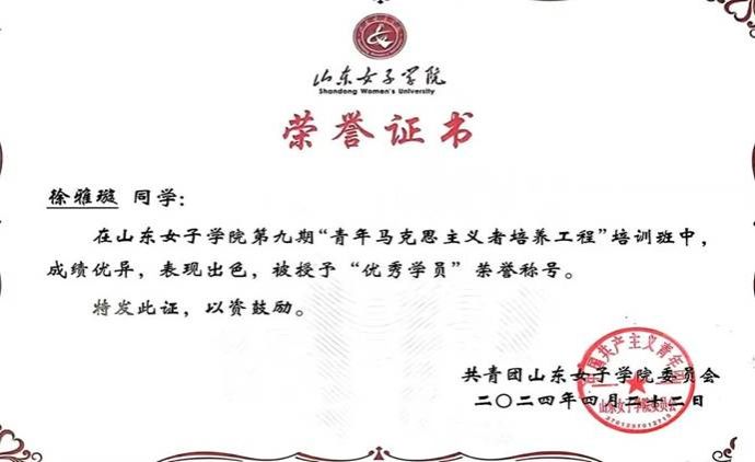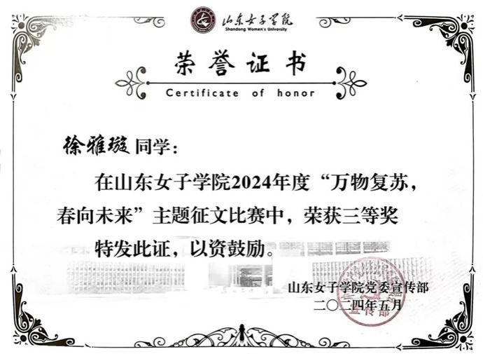 “路虽远,行则将至;事虽难,做则必成。”作为中共预备党员与新时代青年学子,徐雅璇始终以高标准严格要求自己,在学习中精进、在担当中成才、在实践中成长。未来,她将继续带着这份初心与热忱,坦然面对一切困难与挑战,在专业领域持续深耕,在服务他人中传递温暖,以实干书写青春答卷,以奋进姿态奔赴山海,愿与同学们一同勇敢向前,共同奔赴幸福美好的未来,用青春之力诠释新时代青年的责任与担当!